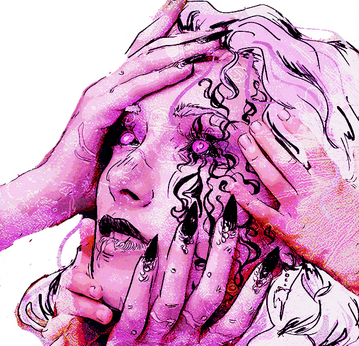EYES: Large black sclera with fuchsia pupils. Expressive to those who can stand the contact. Known to induce dizzy spells and migraines. Decorated with eyebags and a hefty amount of black liner.